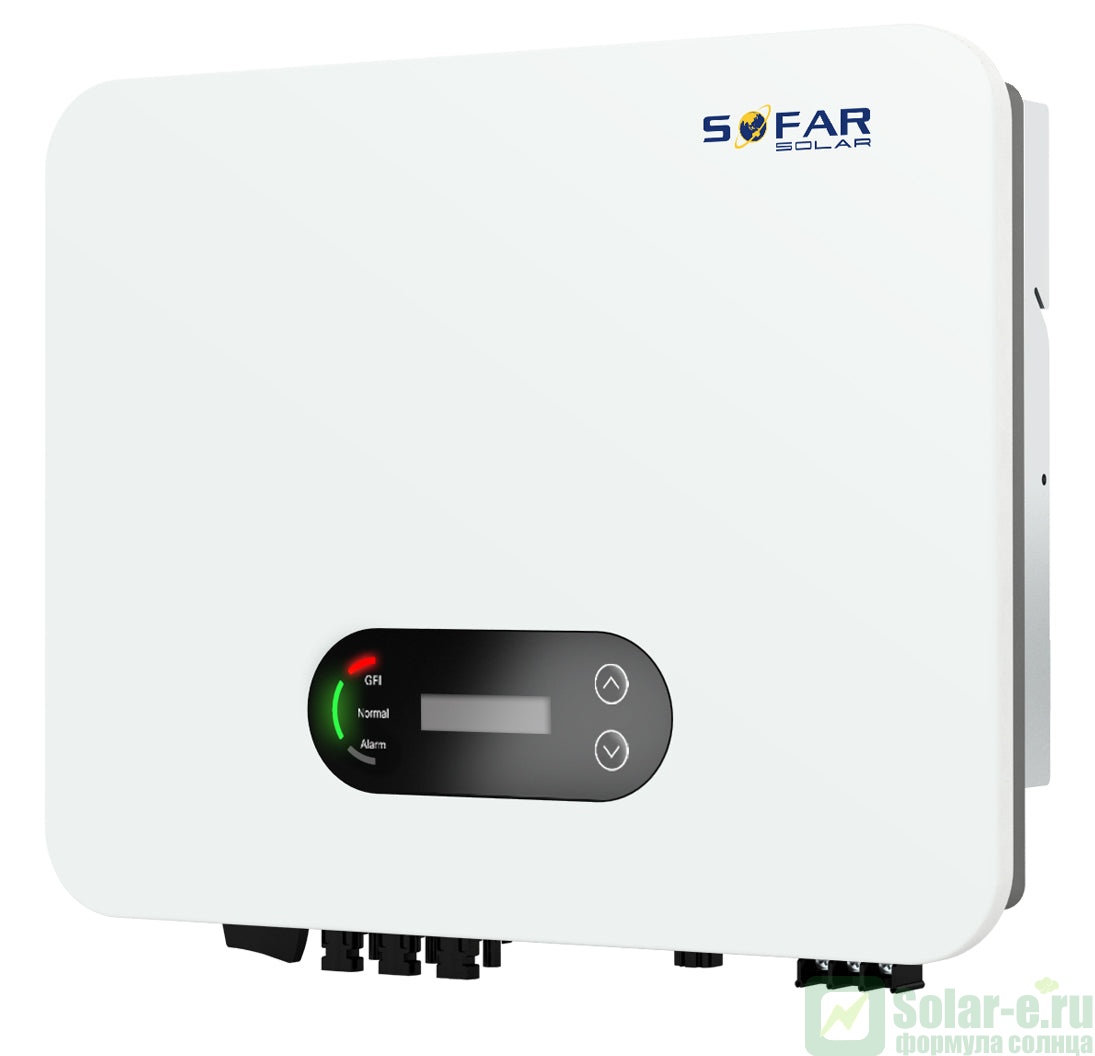 Сетевой солнечный инвертор SOFAR 7.7KTLM-G3 для микрогенерации это современный и высокоэффективный фотоэлектрический сетевой инвертор с MPPT контроллерам заряда второго поколения увеличенной входной мощностью от солнечных батарей. Данный инвертор полностью подходит для построения гелиосистемы для экономии и продажи электроэнергии в сеть ( объекта микрогенерации ). Инверторы серии KTLM-G3 имеют уникальную встроенную функцию - возможность снижения мощности по команде делимитера (устройства, отслеживающего передачу электроэнергии в сеть). Датчики делимитера устанавливаются перед счетчиком, если определяется отдача электроэнергии в сеть, делимитер дает команду инвертору снизить вырабатываемую мощность. Тем самым предотвращается отдача электроэнергии в сеть (очень часто российские счетчики считают отданную электроэнергию как потребленную). Сетевой инвертор используется только совместно с городской сетью, принцип его работы заключается в подмешивании ( добавлении) энергии вырабатываемой солнечными батареями в вашу сеть для обеспечения дополнительной нагрузки или экономии. К примеру, если текущее потребление на вашем объекте 10 кВт*ч, а солнечные батареи вырабатывают 6 кВт*ч, то из городской сети вы возьмете всего 4кВт*ч, а оставшиеся 6кВт*ч в вашу сеть вольет сетевой инвертор.